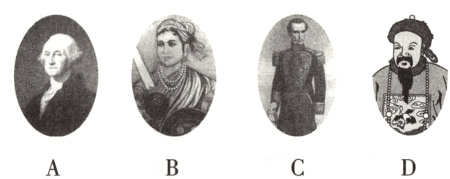 C 提示:A图华盛顿领导了美国独立战争,反抗的是英国殖民统治;B图章西女王领导了印度民族大起义,反抗英国殖民统治;C图玻利瓦尔领导拉丁美洲人民进行了反抗西班牙殖民统治的斗争;D图林则徐“虎门销烟”反抗的是英国鸦片入侵,故选C项。