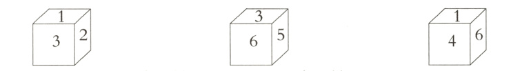 有一个正方体,每个面上分别写着数字1,2,3,4,5,6,有一个人从不同的角度观察到下图的情况。问:这个正方体相对的两个面上的数字各是几?(10分)