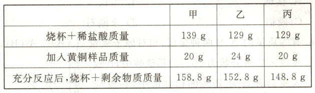 (7)“黄铜”是铜、锌合金,为了测定某黄铜样品中锌的质量分数,甲、乙、丙三位同学分别进行实验,实验数据如下(烧杯质量均为56 g):