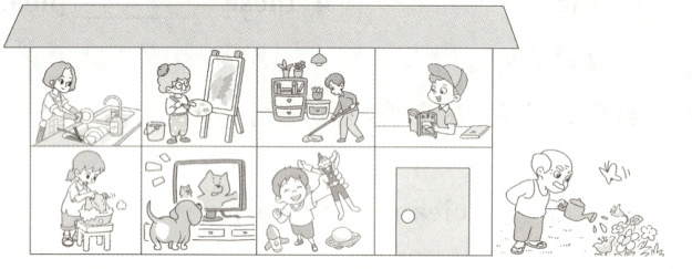 play with toys(玩具) read books watch TV water the flowers wash the dishes wash clothes clean the floor draw pictures