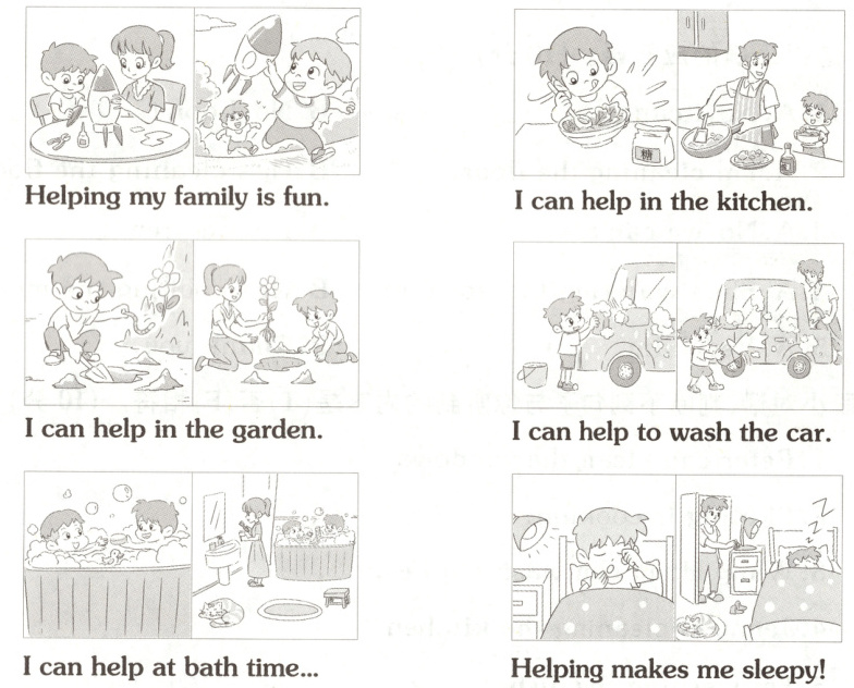 I'm Joe. It's Sunday today. My family are at home. Look! My grandma is in the kitchen. She's cooking the fish. My grandpa is watering the flowers. Mum is washing clothes. Dad is washing the car. My sister is cleaning the floor. My little brother is not doing housework. He's playing computer games. And I'm drawing pictures.