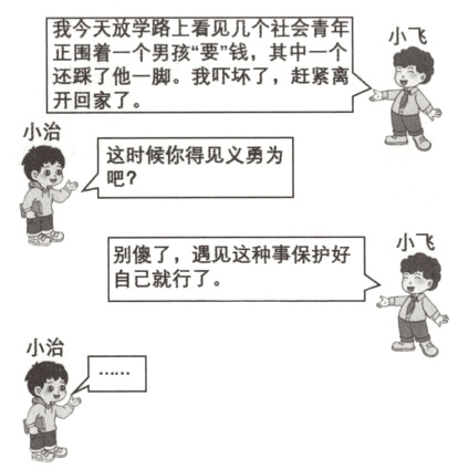 小飞的言行错误。①同违法犯罪作斗争,是包括我们青少年在内的全体公民义不容辞的责任。当国家、公共利益、本人或他人的权益受到不法侵害时,我们要敢于并善于依法维护正当权益。②个人应守护正义。守护正义需要勇气和智慧,面对非正义行为,一方面要敢于斗争,相信正义必定战胜邪恶;另一方面要讲究策略,寻找有效的方法,做到见义“智”为。