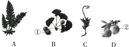 解析 (1)图中A(蕨类植物)和C(苔藓植物)都靠孢子繁殖后代。其中A蕨类植物植株长得比较高大,是因为其有真正的根,并且分化出了输导组织。(2)图中①是种子,②是果实。种子和果实都属于生殖器官。D类植物的种子外面有果皮包被,果皮有保护作用。(3)C是苔藓植物。苔藓植物的叶只有一层细胞,二氧化硫等有毒气体很容易从背腹两面侵入叶细胞,使苔藓植物的生存受到威胁。因此,人们通常把苔藓植物作为监测空气污染程度的指示植物。