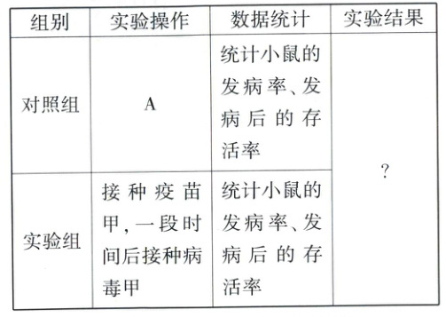 从一出生开始,我们就会陆续接种乙肝疫苗、卡介苗、百白破、小儿麻痹糖丸等疫苗,这些疫苗对我们远离相关传染病功不可没。为检验疫苗甲(利用病毒甲研制的)的有效性,科研人员选择了同一品种、从未感染过病毒甲的小鼠若干只,平均分成两组,进行了以下实验: