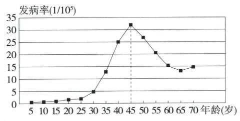 10. (2023北京朝阳月考,22,★☆☆)资料显示,我国每年新增宫颈癌病例远高于世界平均水平。研究表明,感染人乳头瘤病毒(简称HPV)是导致宫颈癌发生的最高风险因素。为此,科学家研发了HPV疫苗,以有效预防人乳头瘤病毒的感染,进而降低宫颈癌的发病率。如图为某年我国肿瘤登记地区宫颈癌发病率随年龄变化的曲线图。下列描述错误的是( )