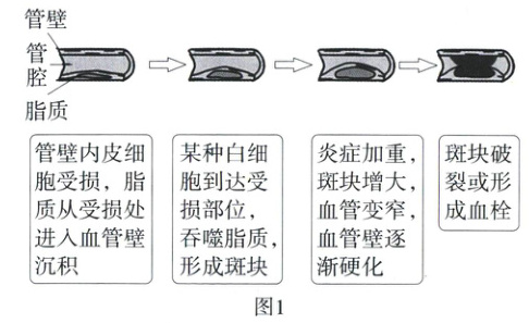 人体具有极为精细而复杂的结构,各组成部分分工合作、协调配合。其中,血管是人体的“生命线”,一旦出现异常,便会造成严重的影响。动脉硬化是导致多种心脑血管疾病的主要原因,全球每年约有2000万人因此而死亡。动脉硬化的发展过程如图1所示。