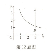 12. 如图,已知点 $A(3,3)$,$B(3,1)$,反比例函数 $y=\frac{k}{x}(k\neq0)$ 图象的一支与线段AB有交点,写出一个符合条件的k的整数值:________.