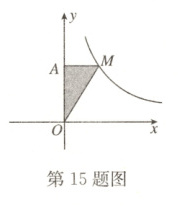 15. 如图,M为反比例函数 $y=\frac{k}{x}$ 的图象上的一点,$MA\perp y$ 轴,垂足为A,$\triangle MAO$ 的面积为2,则k的值为________.