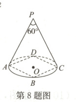 8. 如图,某剧院舞台上的照明灯P射出的光线成“锥体”,其“锥体”正面图的“锥角”是60°. 已知舞台ABCD是边长为6 m的正方形,要使灯光能照射到整个舞台,则照明灯P的悬挂高度是 ( )