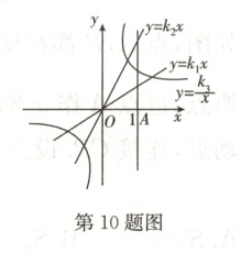 10. 如图,过点$A(1,0)$的直线与$y$轴平行,且分别与正比例函数$y = k_1x$,$y = k_2x$和反比例函数$y=\frac{k_3}{x}$在第一象限相交,则$k_1$,$k_2$,$k_3$的大小关系是________.