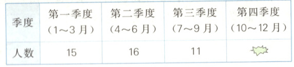 (1)$15\div30\% = 50$(名)(2)第三季度:$11\div50 = 22\%$ 第四季度:$1 - 30\% - 32\% - 22\% = 16\%$
