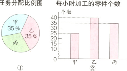 2. 甲、乙、丙三名工人共同加工600个零件,他们所分配到的任务比例如图①,他们每小时加工的零件个数如图②。