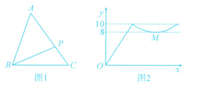 4. 如图1,点P从△ABC的顶点B出发,沿B→C→A匀速运动到点A,图2是点P运动时,线段BP的长度y随时间x变化的关系图象,其中M是曲线部分的最低点,则△ABC的面积是 ( )