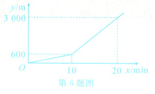 6. 小明从家去上学,先步行一段路,后来,他改骑共享单车,结果到校时迟到了7.5 min,其行驶的路程y(单位:m)与时间x(单位:min)的关系如图,若他出门时直接骑共享单车(两次骑车速度相同),则下列说法正确的是 ( )