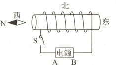 13. 某学校研学小组在探究通电螺线管磁场的实验中,小磁针和螺线管放置于同一水平面内,螺线管为东西朝向,小磁针可在水平面内自由转动。开关S闭合后,小磁针的指向如图所示,则电源A端为_______(选填“正”或“负”)极。当开关S断开时,小磁针N极将_______(选填“不”“向北”或“向南”)偏转。