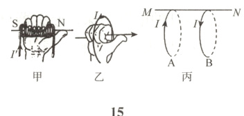 9. 如图甲所示,通电螺线管的极性跟电流的方向有关系,可以用右手螺旋定则来判断。环形电流可以看作是单匝通电螺线管,如图乙所示;在图丙中,把两个线圈A和B挂在水平光滑的固定绝缘细杆MN上,平行靠近放置且保持静止状态。当两线圈通入如图丙所示方向相反的电流时,则两个线圈A和B之间的距离将 ( )