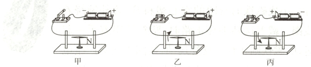 10. 某同学研究电流产生的磁场,闭合开关前,小磁针的指向如图甲所示;闭合开关,小磁针的偏转情况如图乙中箭头所示;只改变电流方向,再次进行实验,小磁针的偏转情况如图丙中箭头所示。下列结论合理的是( )