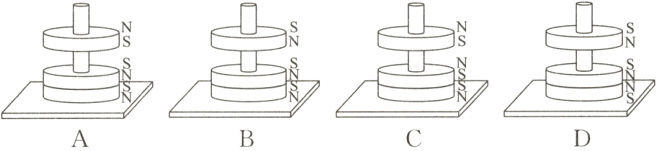4. 将一根光滑的圆木杆竖直固定在水平放置的木板上,杆上套有三个相同的磁环(下端的磁极已标出),磁环内径略大于圆木杆的直径。在磁极间相互作用和重力的作用下,三个磁环在下列四幅图中所示位置可以处于静止状态的是 ( )
