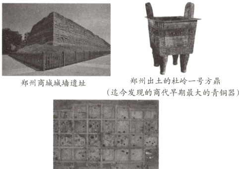 B 【解题思路】根据题干图片和所学知识可知,从商城城墙遗址、青铜器到丧葬礼制,都明确地指向了商代在郑州地区的存在和繁荣,与“商都遗迹”相符,B项正确。