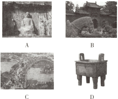 C 【解题思路】根据所学可知,《清明上河图》描绘了北宋都城开封汴河两岸繁荣的景象,C项正确;A、B、D三项分别为龙门石窟、白马寺、司母戊鼎,与题干“开封”不符,排除。