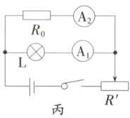 (2)此实验还可以只用电 流表而不用电压表测小灯泡的额定功率,其电路如图丙所示,$R_0 = 10\ \Omega$,其中关键的一步是必须调节滑动变阻器使电流表$A_2$的示数为______A时,再读出电流表$A$的示数,才能计算出小灯泡的额定功率。