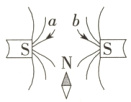 10. 如图,根据放在两个磁极间小磁针的指向,标出两个磁极的名称及a、b两条磁感线的方向。