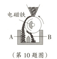 10.如图是电磁选矿机的原理图。电磁选矿机是____在生产中的应用,当它工作时,铁砂将落入____箱,非铁矿石落入______箱。