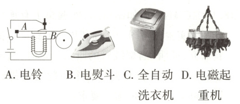 B 提示:分析各装置的工作原理可知,电铃、全自动洗衣机的进水排水阀门、电磁起重机都是利用电磁铁的原理来进行工作的,而电熨斗则是利用电流的热效应工作的。