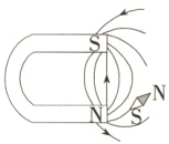 2. 如图是一个蹄形磁铁,图中画出了磁极附近的部分磁感线,小磁针在图示位置静止,请标出蹄形磁铁的N极和S极和至少一条磁感线的方向(用箭头表示)。