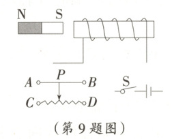 9. (天水中考)如图所示,请将螺线管、滑动变阻器接入电路中,使开关闭合后,螺线管与条形磁铁相互排斥,滑动变阻器滑片P向右移动会使斥力增大。