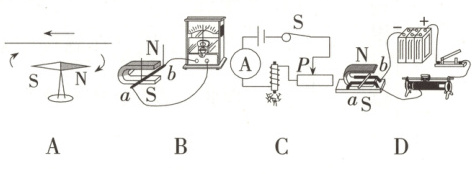 D 提示:扬声器的工作原理是通电线圈在磁场中受力运动。题图A是奥斯特实验,即通电导体周围存在磁场;题图B是电磁感应原理,即闭合电路中的一部分导体做切割磁感线运动,产生电流的现象;题图C是探究电磁铁磁性强弱与电流大小的关系;题图D是电动机的原理图,即通电导体在磁场中受力运动,故D项符合题意。