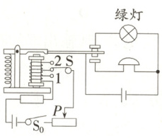 11. 如图所示,当开关S闭合时,电路中 ______ (选填“绿灯”或“电铃”)工作。如果线圈电阻忽略不计,要使电磁铁的磁性增强,应将开关S接到 ______ (选填“1”或“2”)位置,或将滑动变阻器滑片P向 ______ (选填“左”或“右”)移动。