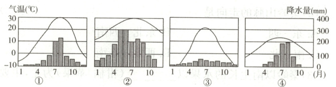 4. 读“我国四大区域的气温曲线和降水量柱状图”,下列判断正确的一组是 ( )