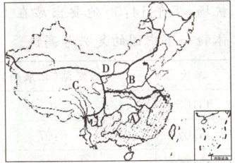 (2)在A、B、C、D区域中,耕地主要分布在________地区,牧区主要分布在________地区。