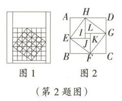 2. 我国三国时期数学家赵爽为了证明勾股定理,创造了“赵爽弦图”,如图1所示.在图2中,若正方形ABCD的边长为14,正方形IJKL的边长为2,且IJ//AB,则正方形EFGH的边长为 ________.
