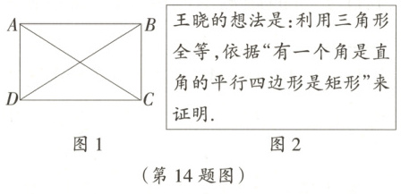 14. 王晓同学要证明命题“对角线相等的平行四边形是矩形”是正确的,她先作出了如图所示的平行四边形ABCD,并写出了不完整的已知和求证.