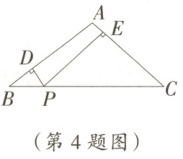 4. 如图,$\triangle ABC$中,$AB = AC = 5$,$BC = 8$,点$P$是$BC$边上的动点,过点$P$作$PD\perp AB$于点$D$,$PE\perp AC$于点$E$,则$PD + PE$的长是( )
