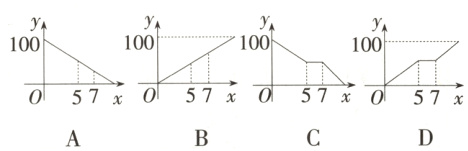 7. 一盘蚊香长100 cm,点燃时每小时缩短10 cm,小明在蚊香点燃5 h后将它熄灭,过了2 h,他再次点燃蚊香.下列四个图象中,大致能表示蚊香剩余长度y(cm)与所经过时间x(h)之间的函数关系的是 ( )