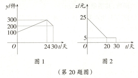 20. (巴彦淖尔中考)如图所示的是本地区一种产品30天的销售图象,图1是产品日销售量y(单位:件)与时间t(单位:天)的函数关系,图2是一件产品的销售利润z(单位:元)与时间t(单位:天)的函数关系,已知日销售利润 = 日销售量×一件产品的销售利润.下列结论错误的是 ( )