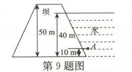 9.如图是某拦河大坝的截面示意图。则A点受到水的压强是(g 取10N/kg) ( )