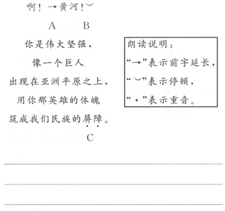 (2)示例:A处“啊”是感叹词,需读出赞颂之情,故应延长读音。B处“黄河”是赞颂对象,要重点突出,且下文抒情,故应停顿。C处“屏障”表达了对黄河的感激之情,故应重读。
