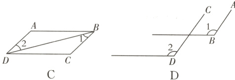 1 教材P15练习T3·变式 下列图形中,由∠1=∠2能得到AB//CD的是( )。