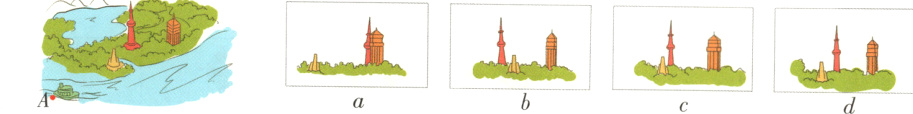 思路分析:看图分析,观察原图,小明乘船游览到A点,他正好看见纪念碑的左面以及远处的塔和方楼,此时纪念碑在塔和方楼之间,所以他先看到的是图b。船继续前进,小明渐渐看见纪念碑的前面,此时塔在纪念碑和方楼之间,但离纪念碑较近,所以这时他看到的是图c。随后,小明看见了纪念碑的右面,但仍能看见前面,说明此时他看到的是图d,在图d中塔在纪念碑和方楼之间,但离纪念碑越来越远。最后,小明看见了纪念碑的整个右面及前面的一小部分,塔被方楼遮住了一部分,说明此时他看到的是图a。