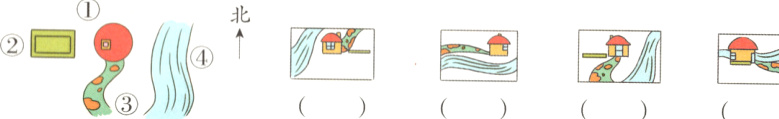 2. 下面的照片是从空中看到的小熊的家,小熊家的西面有一块长方形菜地,东面有一条小河。下面四个画面分别是站在哪个位置看到的?将序号填在括号里。