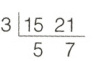 $12\div13=$ $5\div17=$ $21\div27=$ $15\div30=$