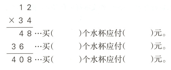 3. 刘老师买了34个水杯给班上的34位同学,每个12元。根据下面的竖式,在( )里填上合适的数。