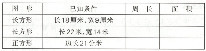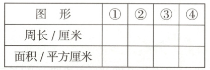 这4个图形的周长和面积各是多少?数一数,填在下面。