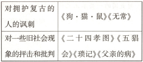 (1)小王同学在阅读《朝花夕拾》时,发现这本书记述了鲁迅从孩童到青年的成长历程,思想内涵丰富。请你帮助他完整填写《朝花夕拾》梳理表。