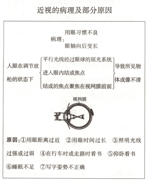 示例:①眼轴向后变长 ②进入眼内聚焦在视网膜前面,导致所见物体成像不清 ③用眼方法要正确,用眼环境要合适