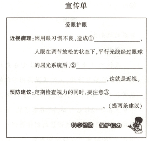 13. (2023·贵州)学生会卫生部为帮助同学们预防近视,查阅资料后,梳理了近视的病理及部分原因,请整合其内容,补全下面的宣传单。注意表达简明、连贯、通顺。